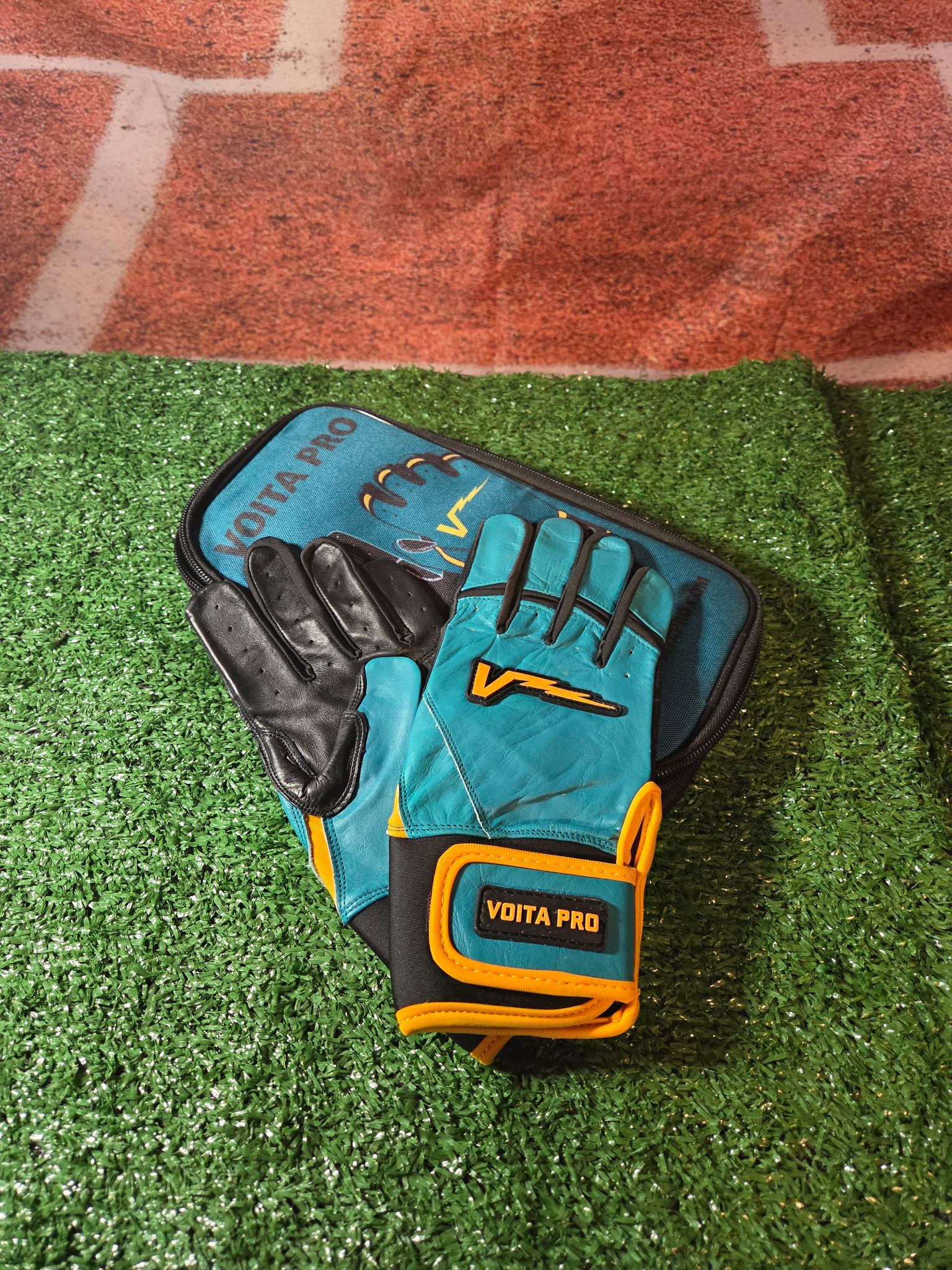 Bring bold style and performance together with these teal, black, and yellow batting gloves. Crafted from supple, high-quality leather, they provide a smooth, comfortable feel and dependable grip at the plate. The short cuff design allows for greater wrist mobility and a lightweight, natural fit, ideal for hitters who prefer flexibility. Available in Small, Medium, and Large.